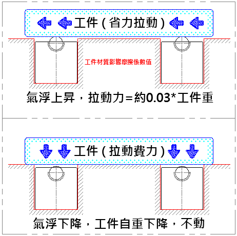 例: 工件重 500kg ,上浮時,人員拉動約 15kg 即可